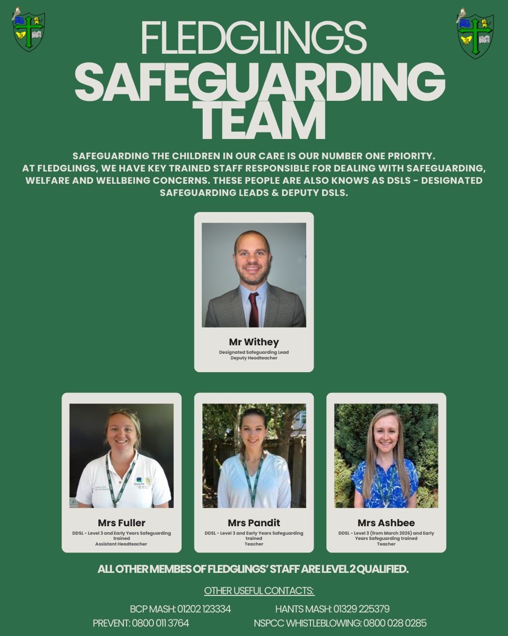 We are all dedicated to the welfare and protection of our children and if an occasion does arise where we need to speak to you about your child, please understand that their safety and happiness is our top priority. Mrs Pandit, Mrs Ashbee and Mrs Fuller (EYFS phase lead) are our Deputy Designated Safeguarding Leads at Fledglings and Mr Withey is the school’s Dedicated Safeguarding Lead. Please see our website for information on safeguarding in our school.